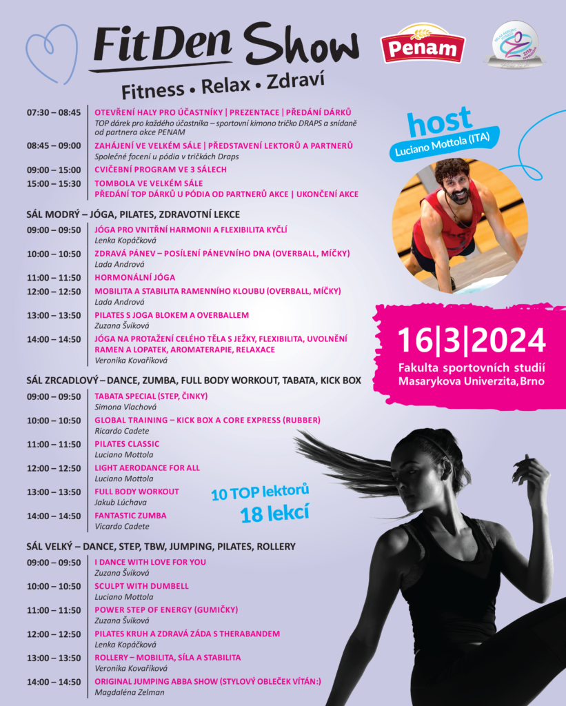 Už se to blíží! Největší fitness akce v Brně opět pod taktovkou Aerobic Zita. Jsme hrdí, že můžeme být letos hlavním partnerem této akce plné cvičení. Motem celé akce je Fitness – Relax – Zdraví! Ve třech sálech Fakulty sportovních studií Masarykovy Univerzity v Brně se mohou účastníci těšit na jogu, zdravotní cvičení, dance, step, jumping, pilates, kick box a spoustu dalšího cvičení.