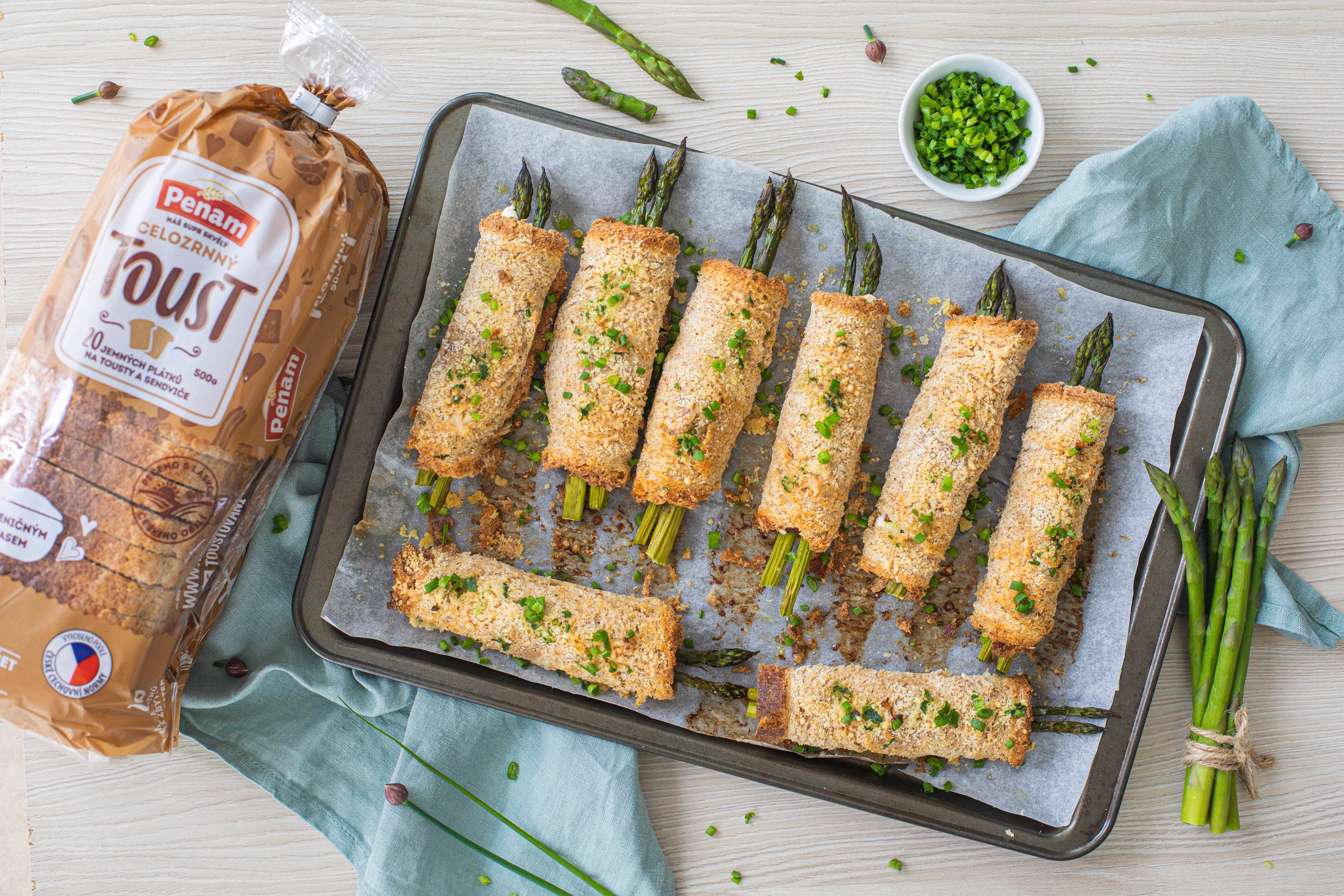 Tousty rozválejte válečkem na tenké plátky. Sýr smíchejte s pažitkou a osolte a opepřete dle chuti. Plech vyložte pečicím papírem a troubu předehřejte na 180 °C. Každým plátkem slaniny obalte dva výhonky chřestu a vyskládejte na připravený plech. Dejte na 5 minut do trouby, aby se slanina lehce opekla. Připravené plátky toustů rovnoměrně potřete sýrem s pažitkou. Poté do nich zabalte lehce opečené chřestové výhonky se slaninou a vyskládejte opět na plech. Posypejte parmazánem a pokapejte olivovým olejem. Dejte zapéct do trouby na 10–15 minut. Nechte vychladnout a podávejte posypané nasekanou pažitkou.