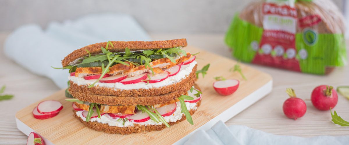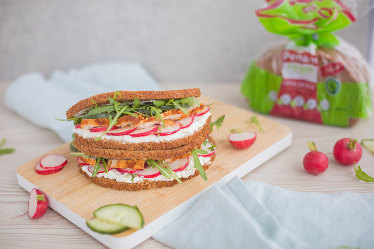 Na potřený spodní krajíc vyskládejte polovinu ředkviček, na ně navrstvěte plátky pečeného kuřecího a následně okurku. Poté posypte rukolou a přiložte druhý plátek potřeného chleba. Stejný postup opakujte i u druhého sendviče.