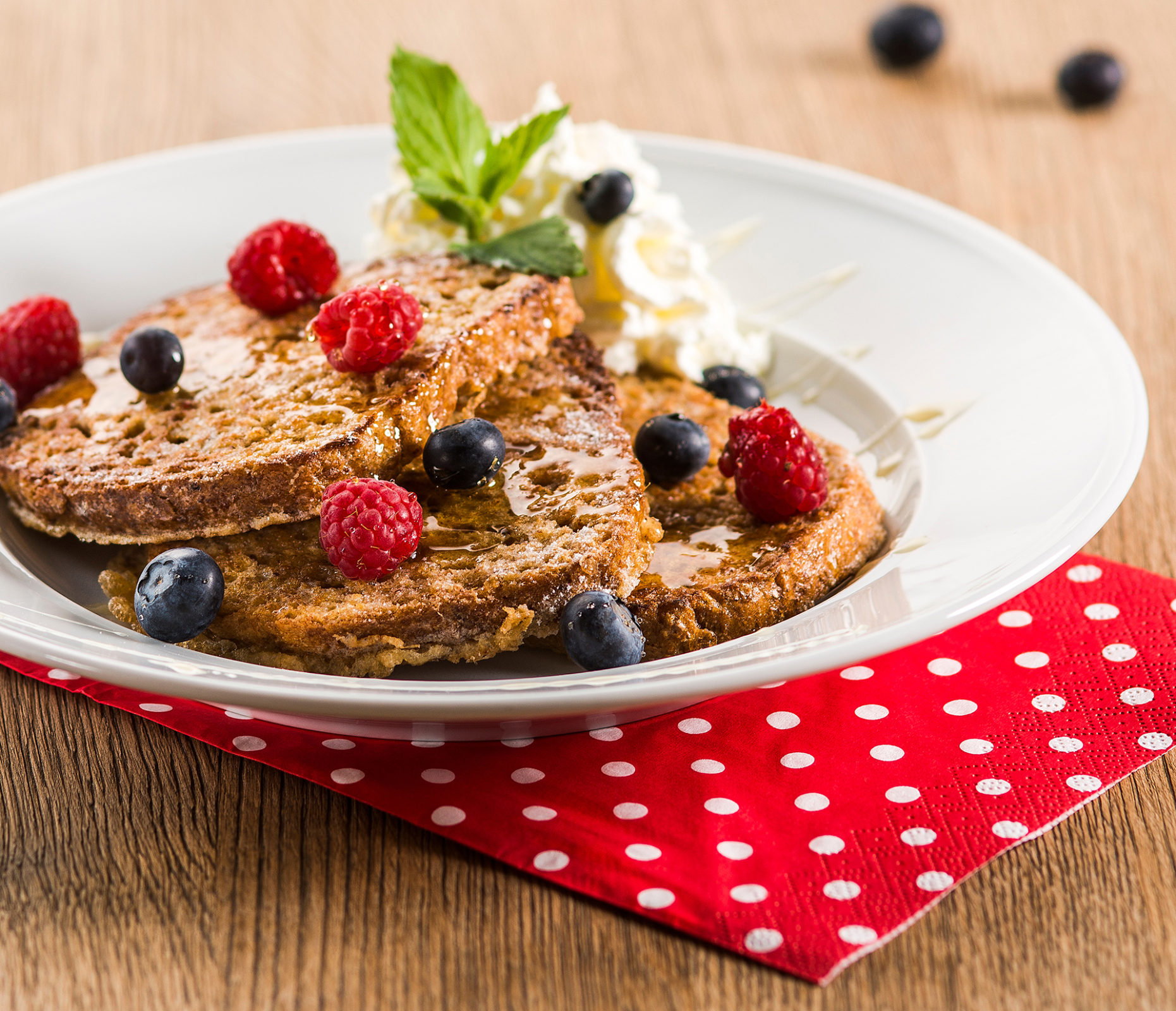 Toasty namočíme do rozšlehaného vejce se skořicí a opečeme je na pánvi s rozpuštěným máslem. Hotové toasty dáme na talíře a posypeme cukrem moučkou. Na toasty poklademe ovoce nakrájené na kolečka a ozdobíme šlehačkou. Můžeme pokapat medem nebo rozpuštěnou čokoládou. Dozdobíme mátou.