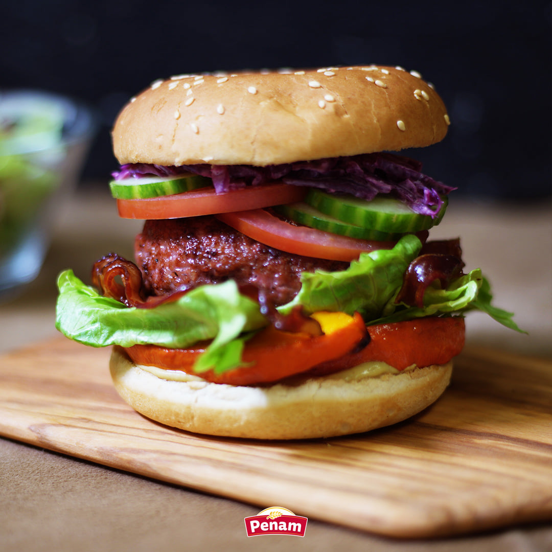 Mleté maso smíchejte se solí, pepřem a chilli. Z hmoty vytvarujte nižší placky, s mírně prohloubeným středem. Na pánvi opečte hamburgerové bulky. Maso propečte podle toho, jak jej máte rádi. Mezi bulky postupně vkládejte ingredience – pár lístků salátu, tenká kolečka rajčat, okurky, cibuli a maso. Můžete přidat i plátek sýra a vypečenou slaninu. Bulky Penam pak namažte hořčicí nebo majonézou.