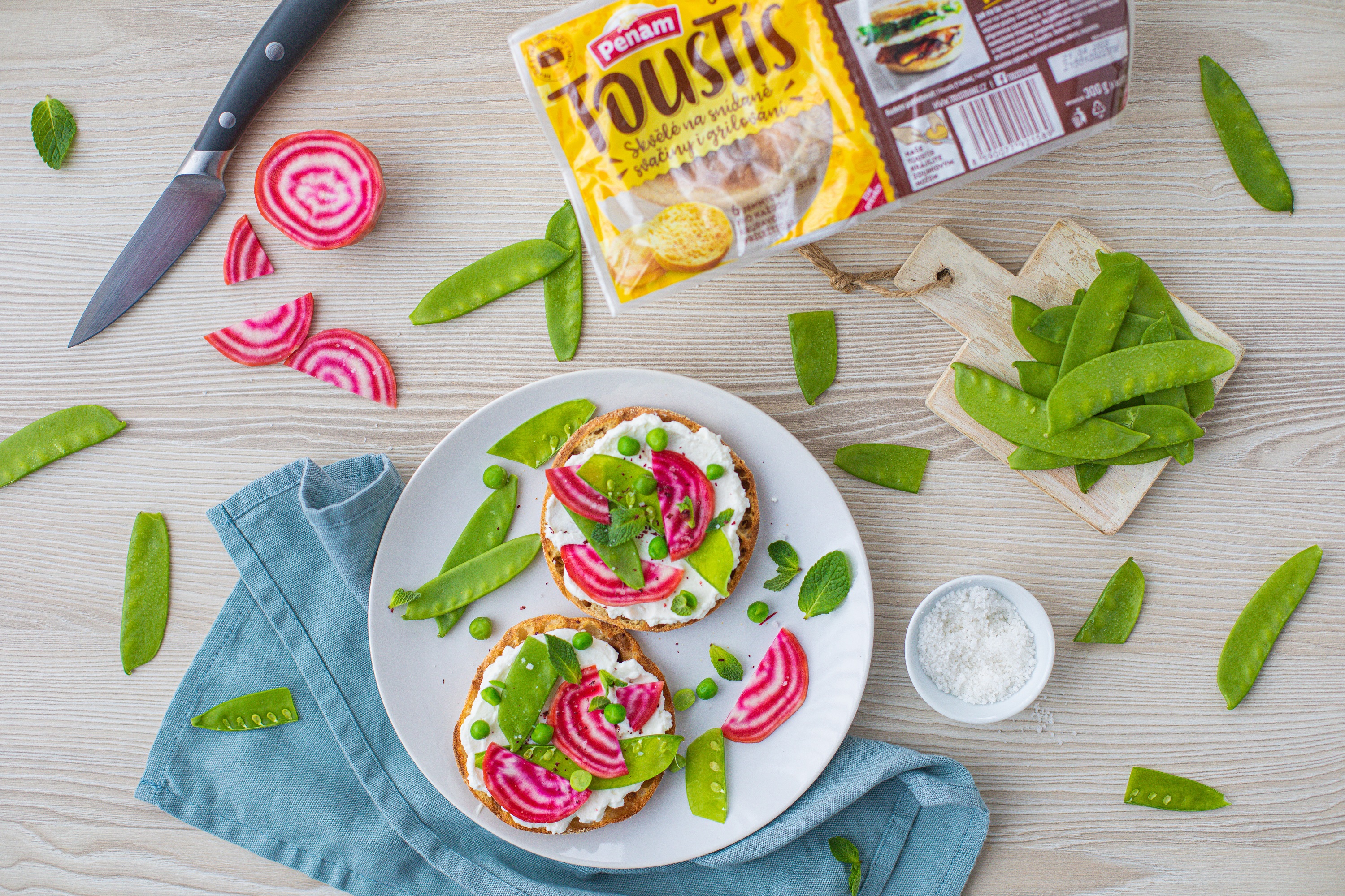 Toustís rozpulte a opečte v topinkovači. Nechte vychladnout a pomažte ricottou. Ozdobte plátky řepy, oběma typy hrášku a čerstvou mátou. Osolte a opepřete a pokapejte olivovým olejem.