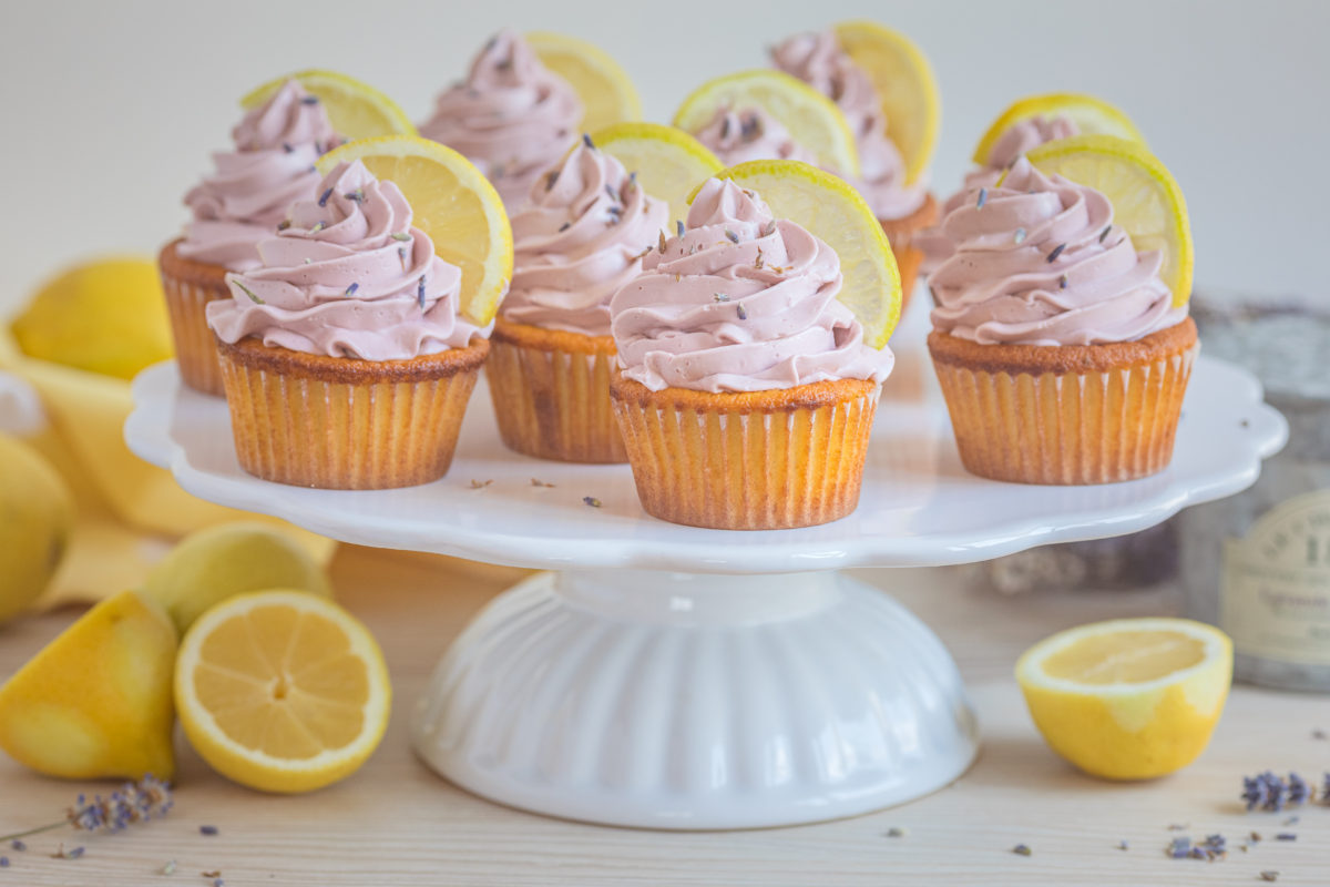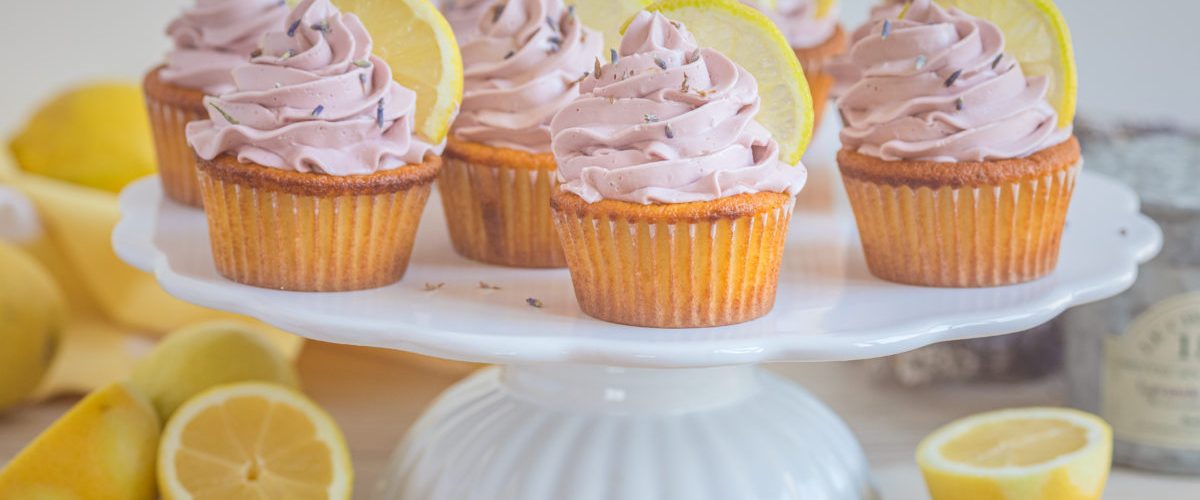 Krémem naplňte cukrářský sáček s ozdobnou špičkou a vychladlé cupcaky ozdobte. Posypte sušenou levandulí a dozdobte půlkou plátku citronu.