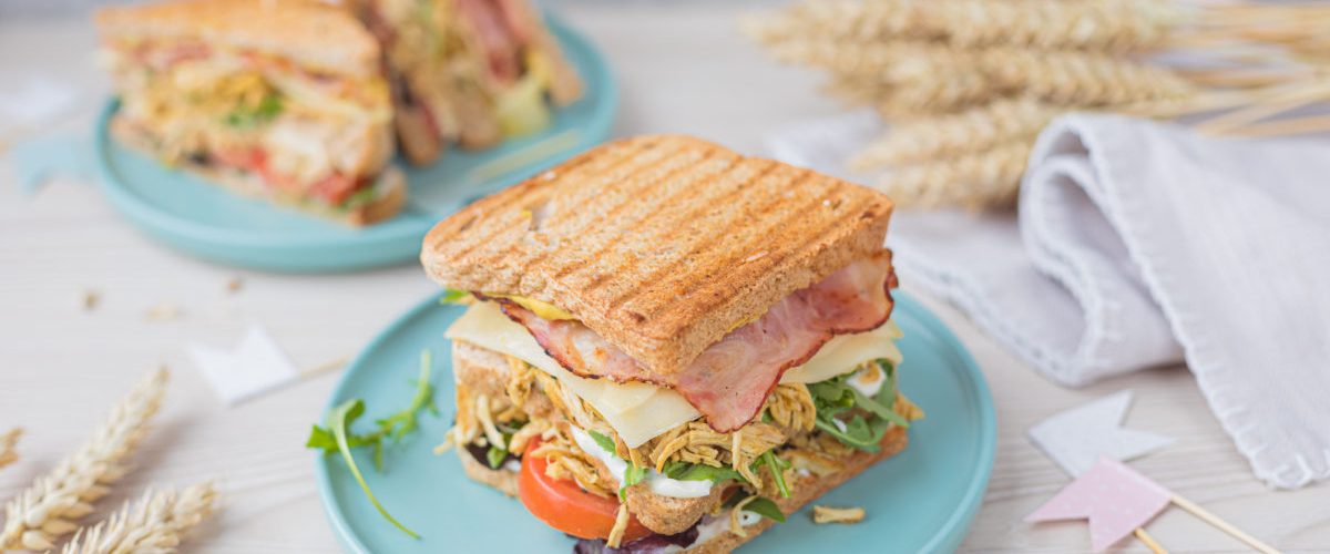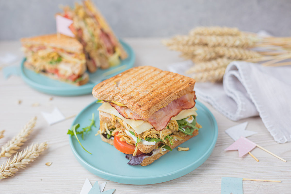 Spodní opečený plátek pomažte 2 lžičkami majonézy, vyskládejte na ni salátové listy, dva plátky rajčete. Poté navrstvěte maso a přiložte plátek toustu namočeného ve šťávě. Jeho vrchní vrstvu pomažte lžičkou majonézy, navrstvěte salátové listy a trhané maso, dále plátek sýra, opečenou slaninu a přiložte třetí plátek toustu potřený 2 lžičkami hořčice. Stejným způsobem připravte i druhý sendvič.