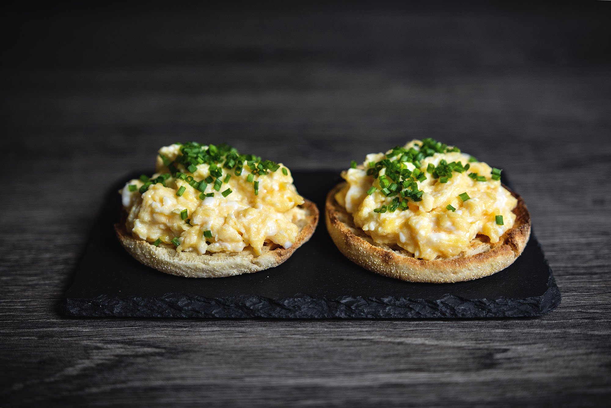 Toustís rozkrojíme nožem na 2 půlky. Každou opečeme nasucho na rozpálené pánvi z obou stran. Poté na pánvi rozpálíme máslo, umícháme vejce a dochutíme. Obě půlky Toustís namažeme máslem a přidáme umíchaná vejce. Ozdobíme krájenou pažitkou. Teplé podáváme.