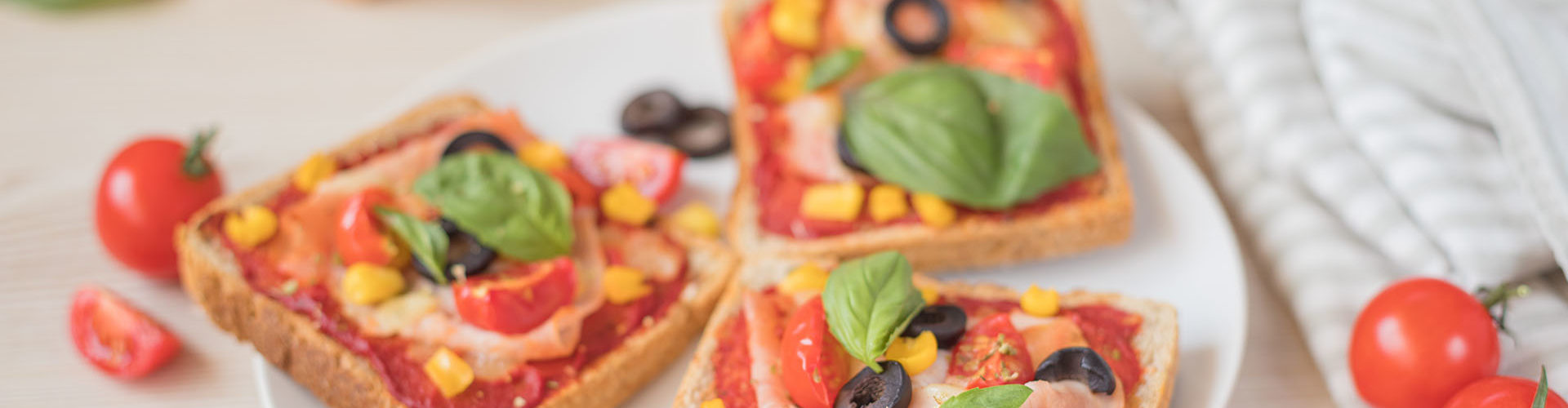 Každý plátek ozdobte šunkou, natrhanou mini mozzarellou, několika zrníčky kukuřice, nakrájeným cherry rajčátkem a černou olivou. Dejte na 5-10 minut zapéct do trouby. Poté nechte chvilku vychladnout a ozdobte čerstvou bazalkou.