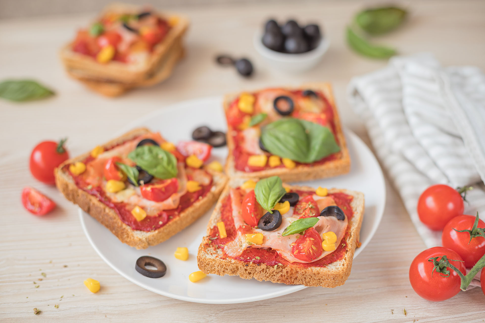 Každý plátek ozdobte šunkou, natrhanou mini mozzarellou, několika zrníčky kukuřice, nakrájeným cherry rajčátkem a černou olivou. Dejte na 5-10 minut zapéct do trouby. Poté nechte chvilku vychladnout a ozdobte čerstvou bazalkou.
