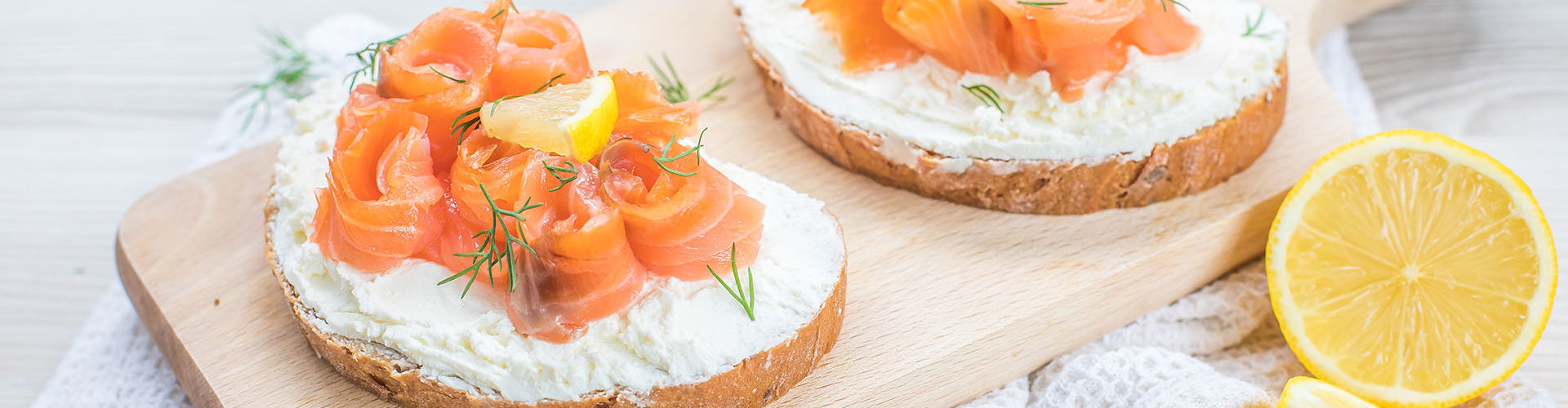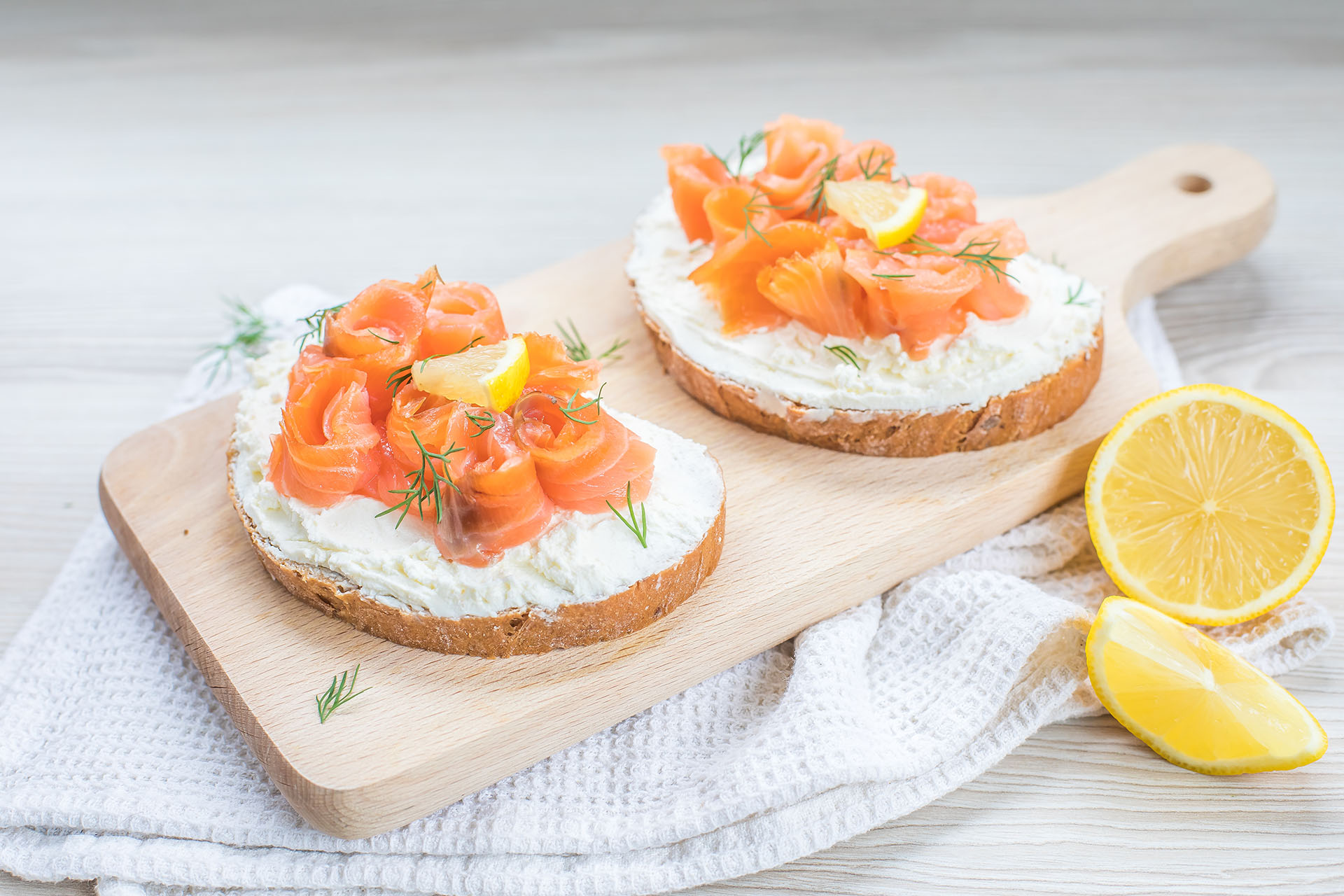 Ricottou potřete oba krajíce. Na každý vyskládejte poloviční množství uzeného lososa. Z poloviny citronu odkrojte plátek a nakrájejte na kousky, kterými ozdobte chléb. Šťávou ze zbylého citronu pokapejte lososa, posypte koprem a podávejte.