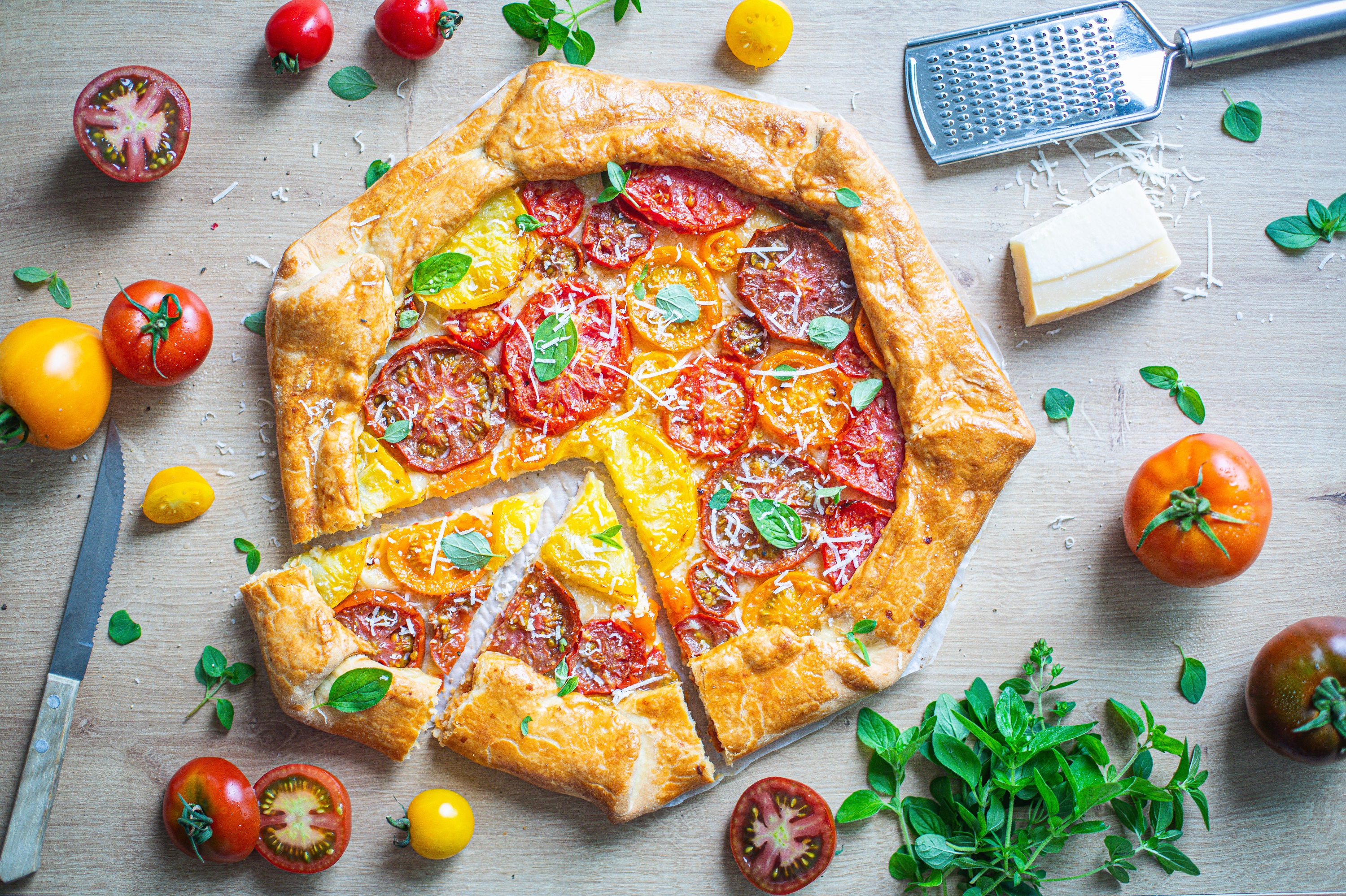 Dvě hodiny před tím než se začne rajčatová galetka péct si nejprve připravte těsto. Smíchejte mouku, sůl a prášek do pečiva. Do směsi přidejte na kostičky nakrájené vychlazené máslo a zapracujte. Pokapejte vinným octem a přidejte ledovou vodu a vypracujte nelepivé těsto. Pokud je potřeba, přidejte trochu mouky.