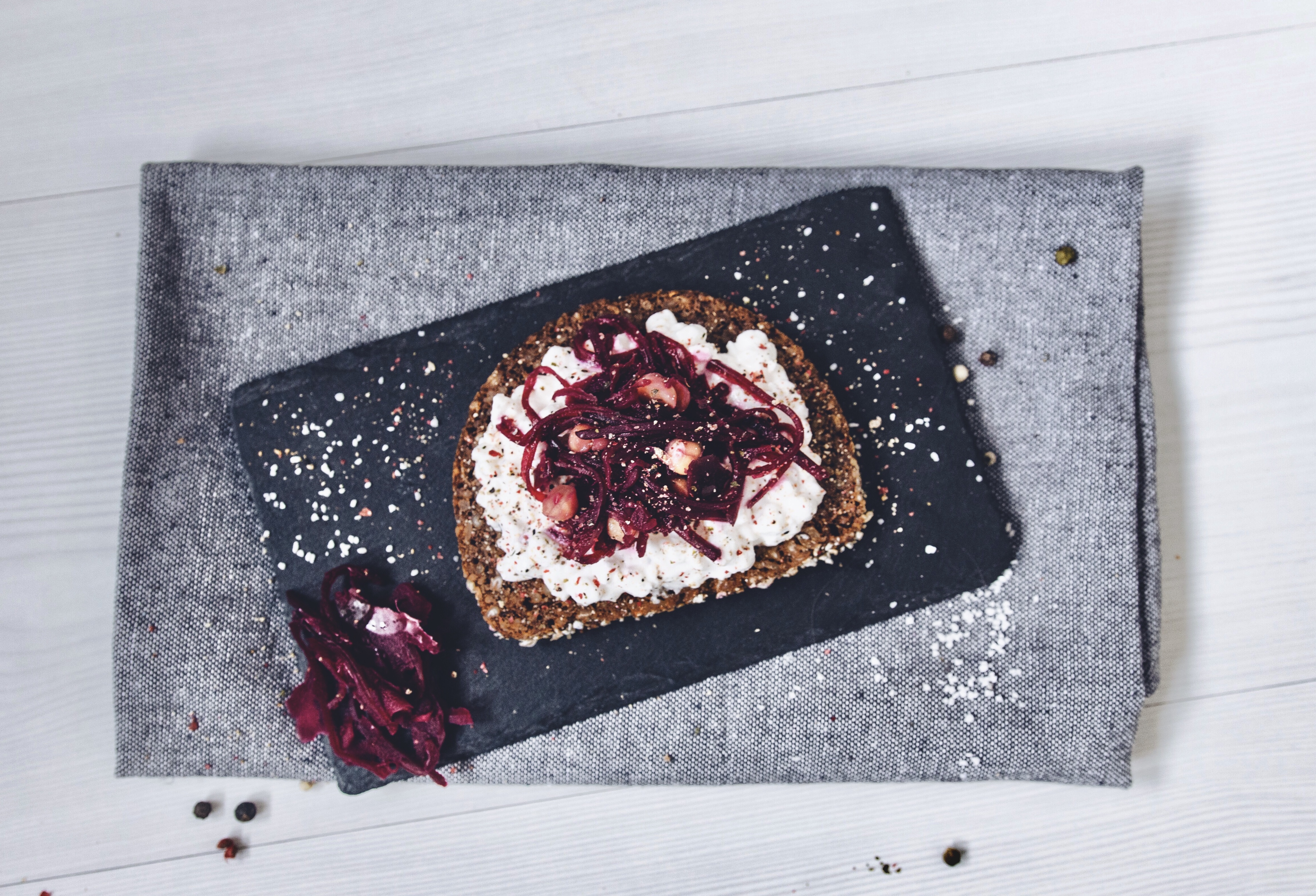 Cottage osolíme a opepříme dle chuti, namažeme na Celozrnný chléb, přidáme cizrnu a hromádku červené řepy.