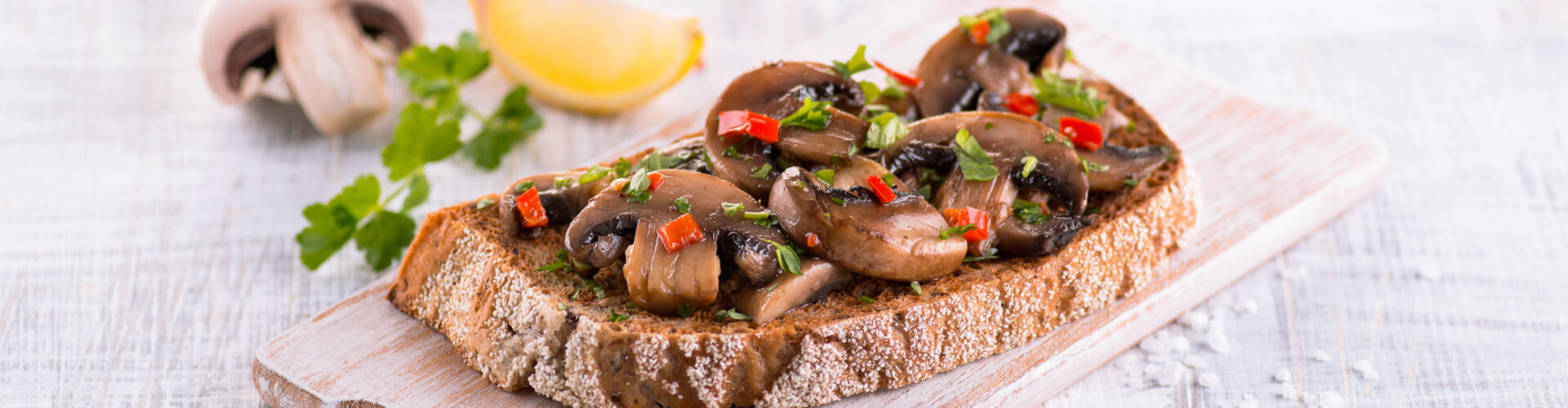 Žampiony nejprve očistíme a nakrájíme na menší kousky. Na pánvi rozehřejeme olivový olej a krátce orestujeme nadrobno nasekaný česnek. Přidáme připravené žampiony, osolíme, opepříme a podle chuti přidáme i nasekanou chilli papričku. Vše restujeme, dokud houby nepustí šťávu a nezískají zlatavou barvu. Na závěr je zakápneme trochou citronové šťávy a posypeme čerstvě nasekanou petrželovou natí. Podáváme na plátku chleba, který jsme si předem nasucho opekli na pánvi.