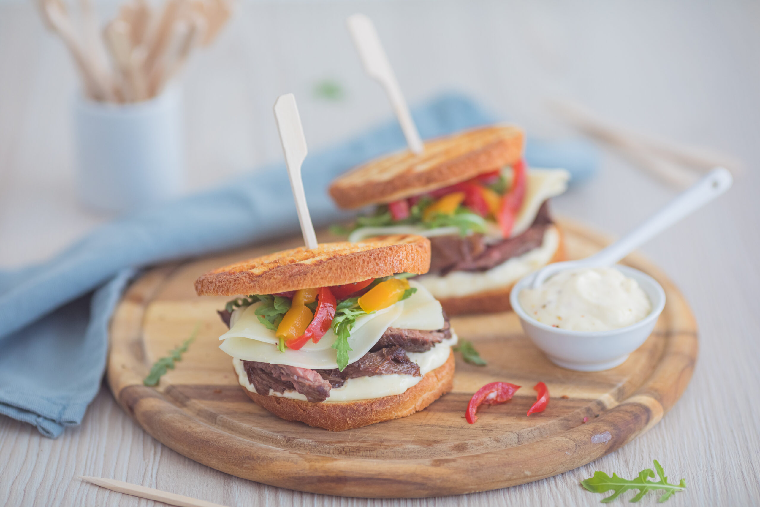 Krajíce Penam proteinového toustu opečte na sucho. Spodní plátky sendvičů pomažte citronovou majonézou. Na ni vyskládejte nakrájený steak, sýr provolone, rukolu a nakrájené papričky. Přiklopte vrchními krajíci.