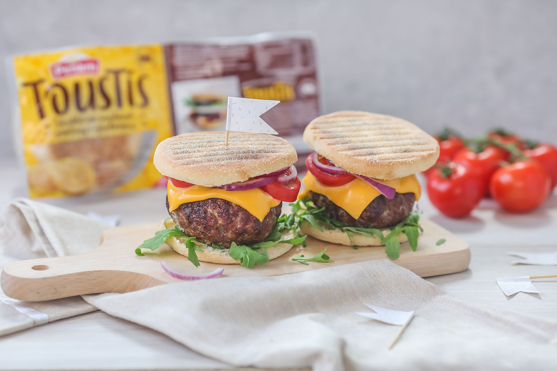 Toustís rozkrojte, opečte a na spodní díl navrstvěte rukolu, ogrilovaný burger, plátek sýru, 2 plátky rajčete a 3 kolečka cibule. Stejný postup opakujte u druhého burgeru a podávejte. Můžete dochutit kečupem nebo majonézou.