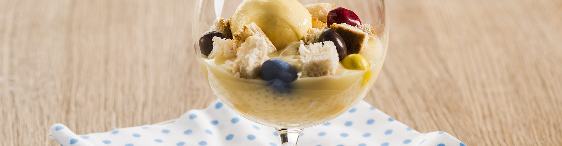 Toustový chléb nakrájíme na kostičky, opečeme a posypeme moučkovým cukrem. Mezitím si připravíme pudink dle návodu na etiketě. Do připravené misky pudink nalijeme, přidáme kostičky toustového chleba, čokoládové bonbóny a dvě lžíce zmrzliny. Dozdobíme mátou a podáváme.