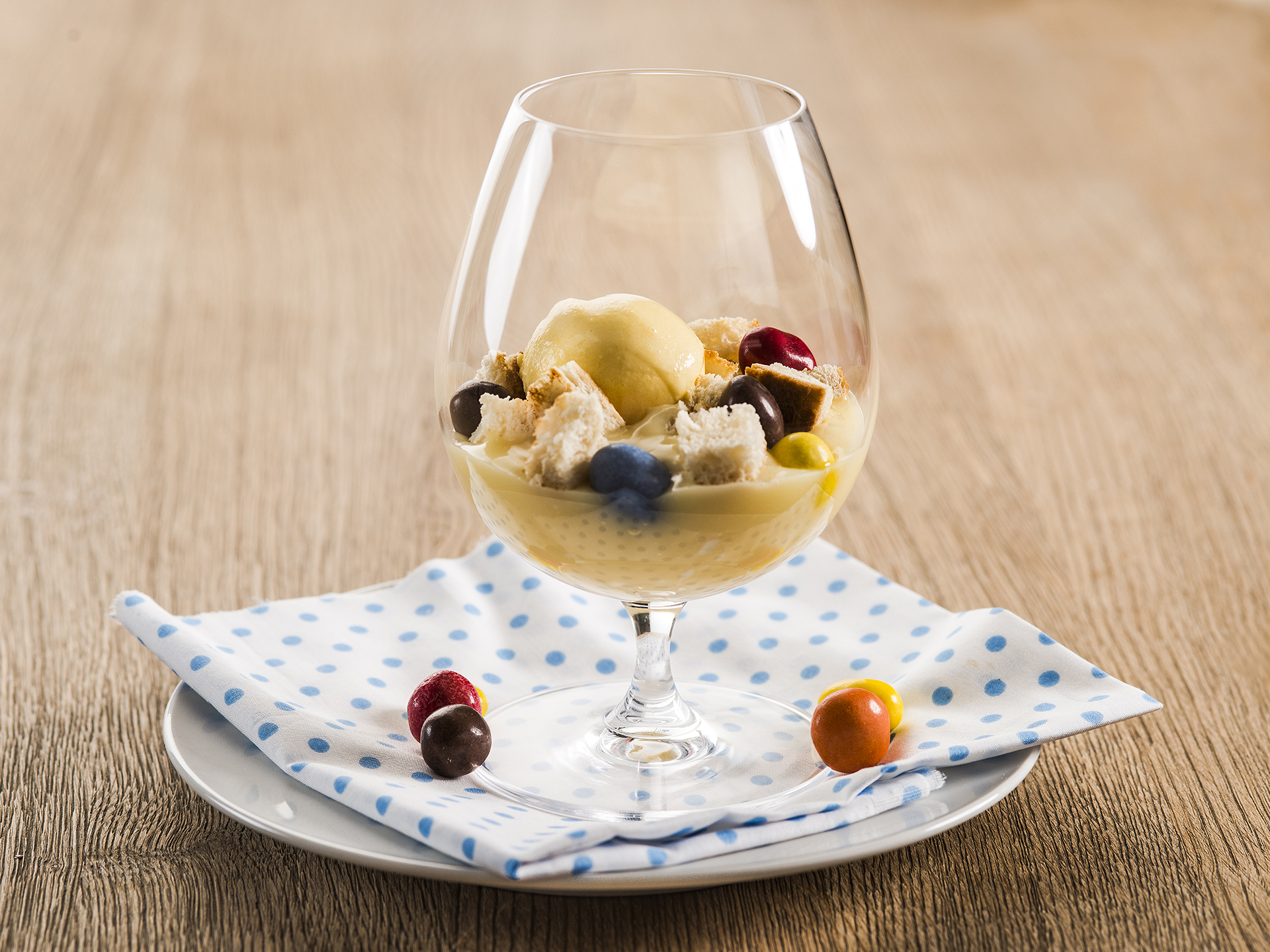 Toustový chléb nakrájíme na kostičky, opečeme a posypeme moučkovým cukrem. Mezitím si připravíme pudink dle návodu na etiketě. Do připravené misky pudink nalijeme, přidáme kostičky toustového chleba, čokoládové bonbóny a dvě lžíce zmrzliny. Dozdobíme mátou a podáváme.