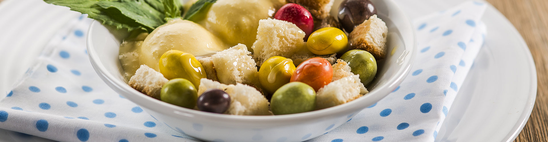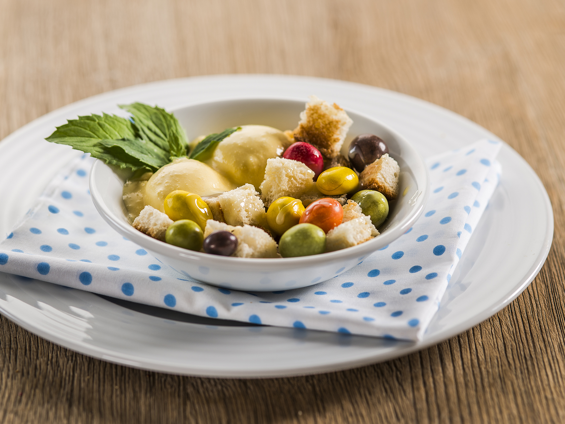 Toustový chléb nakrájíme na kostičky, opečeme a posypeme moučkovým cukrem. Vše vložíme do misky a zalijeme salkem. přidáme čokoládové bonbóny a dvě lžíce zmrzliny. Dozdobíme mátou a ihned podáváme.
