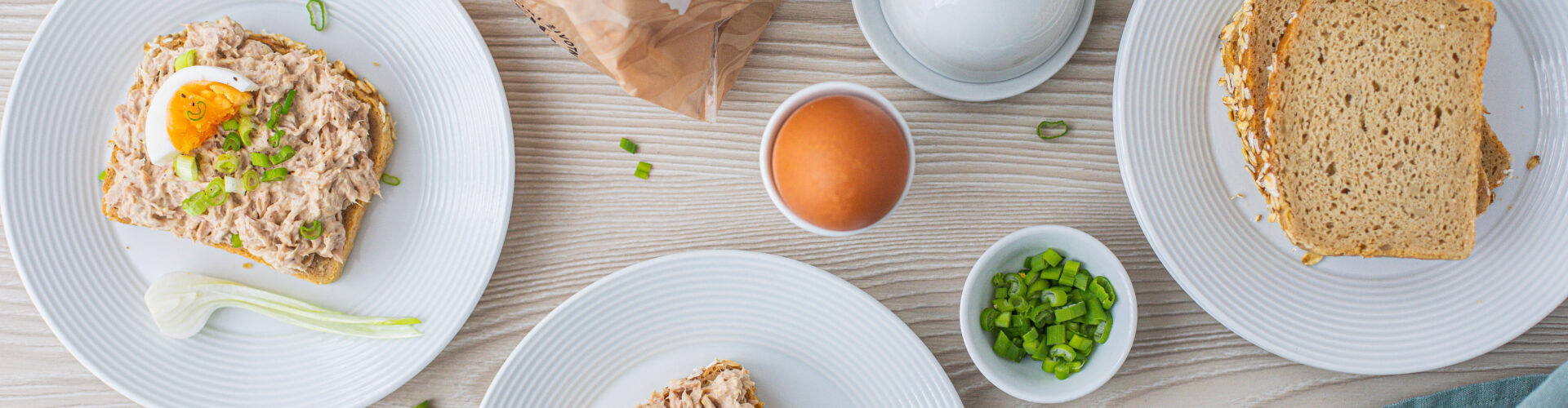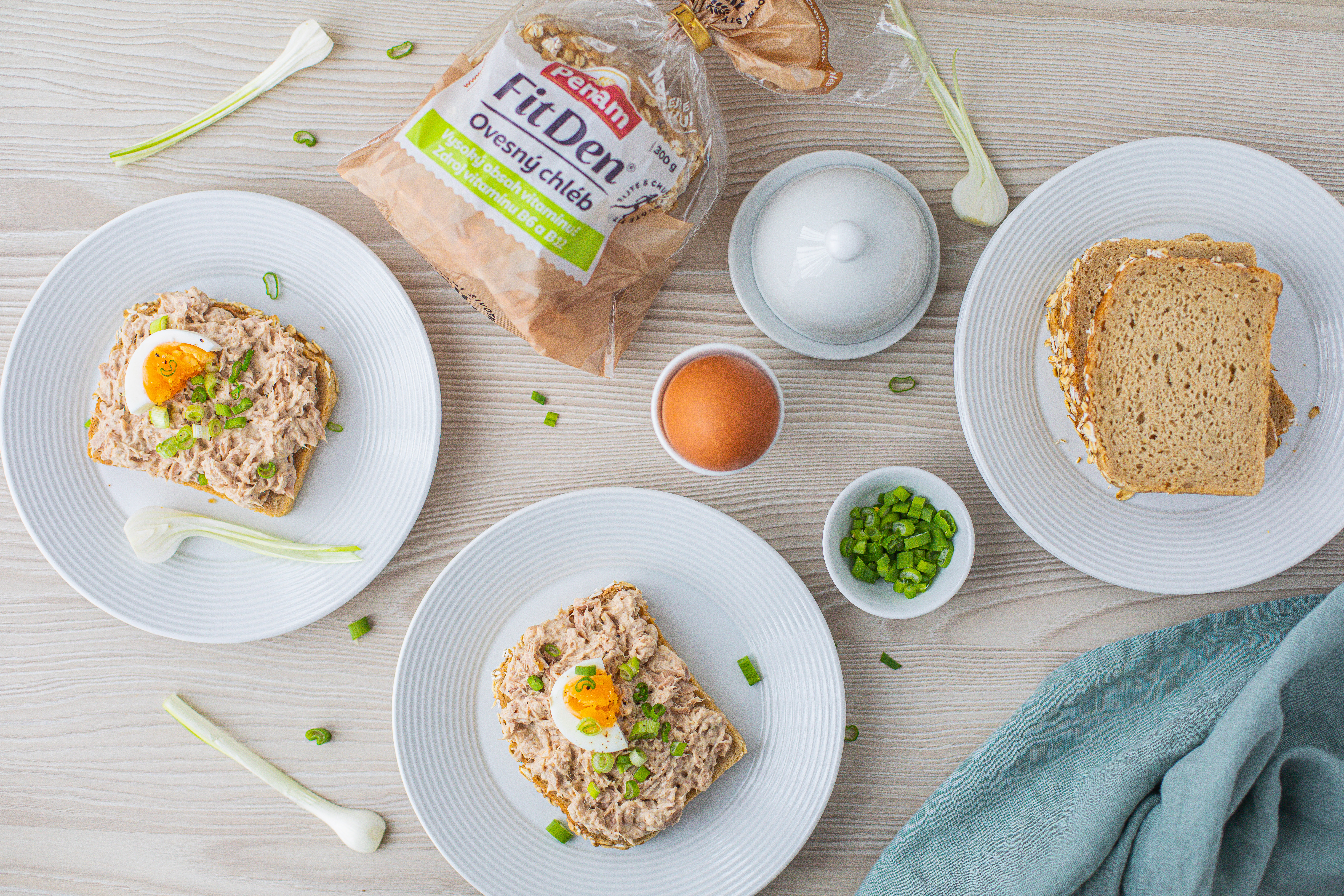 Tuňáka nechte okapat, dejte do misky a přidejte tvaroh, lučinu, hořčici a citronovou šťávu. promíchejte a osolte a opepřete dle chuti. Pomazánku namažte na plátku ovesného chleba, ozdobte nakrájeným vejcem a posypejte cibulkou.