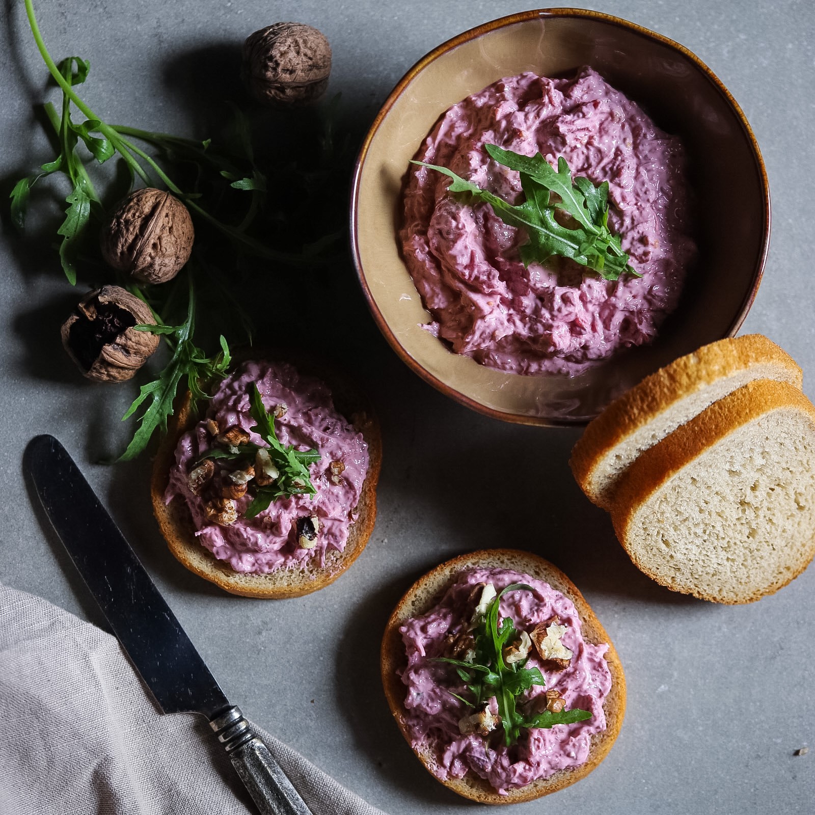 Tvaroh smícháme v misce s najemno nastrouhanou řepou, křenem, solí a pepřem. Necháme alespoň hodinku odležet v lednici. Tousty můžeme opéct nebo je necháme neopečené, namažeme pomazánkou, ozdobíme rukolou a posypeme nasekanými vlašáky.
