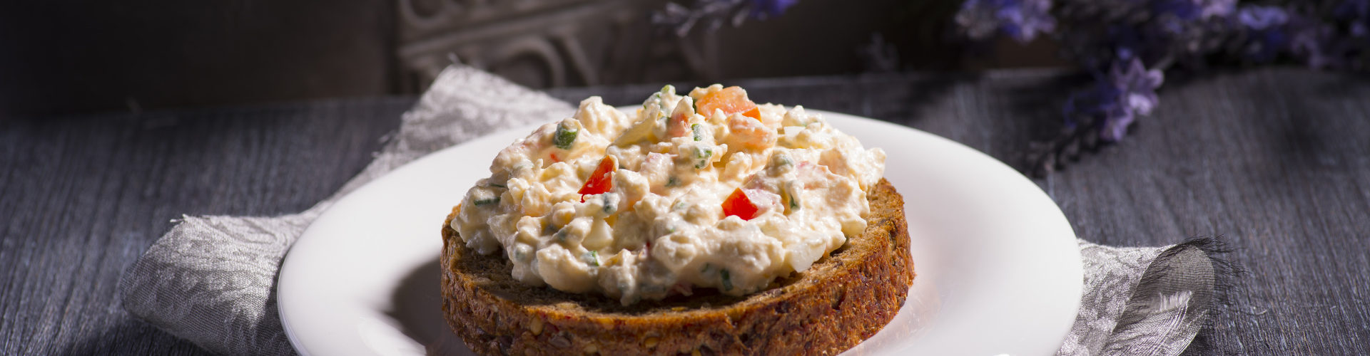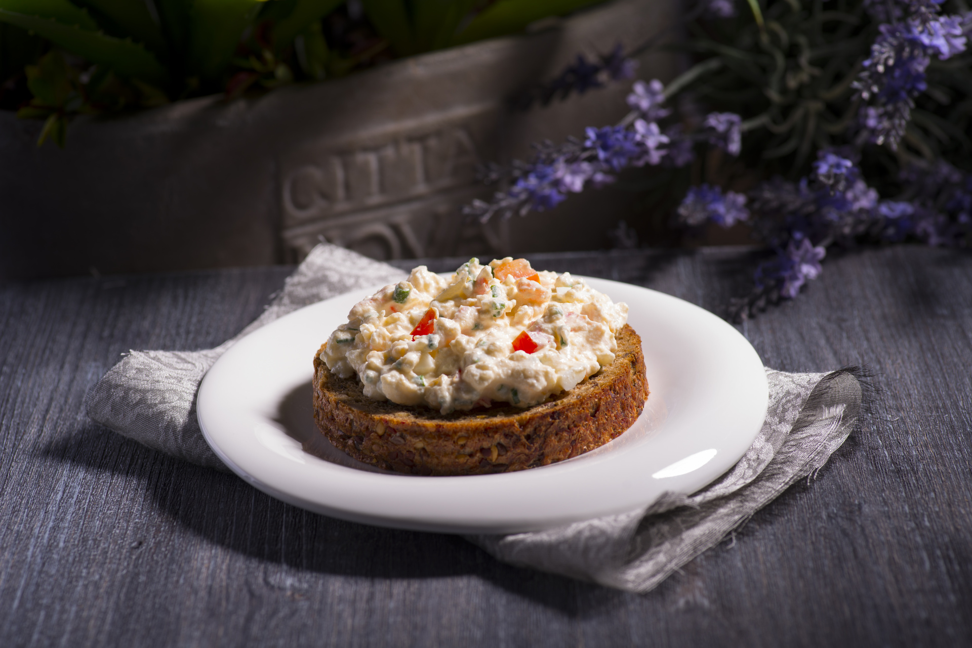 Do tvarohu zamícháme hořčici, cibulku a pažitku. Nadrobno nakrájená vejce a rajče opatrně vmícháme do tvarohu.