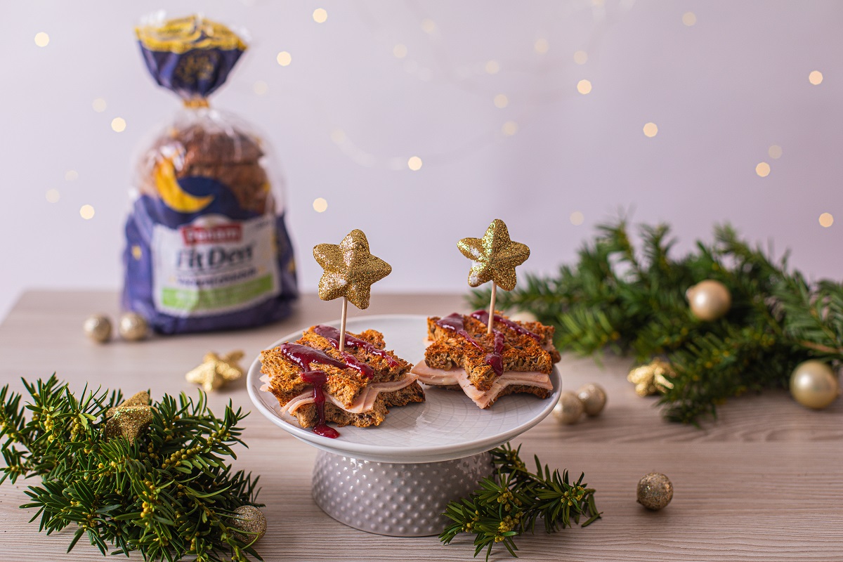 Z chlebíku a šunky vykrojte 4 hvězdy. Spodní hvězdy pomažte brusinkovou omáčkou, poté vyskládejte vykrojené hvězdy šunky a navrch nakrájejte plísňový sýr. Přiložte vrchní hvězdy a zapečte v toustovači. Hotové hvězdy pokapejte zbylou brusinkovou omáčkou a podávejte.
