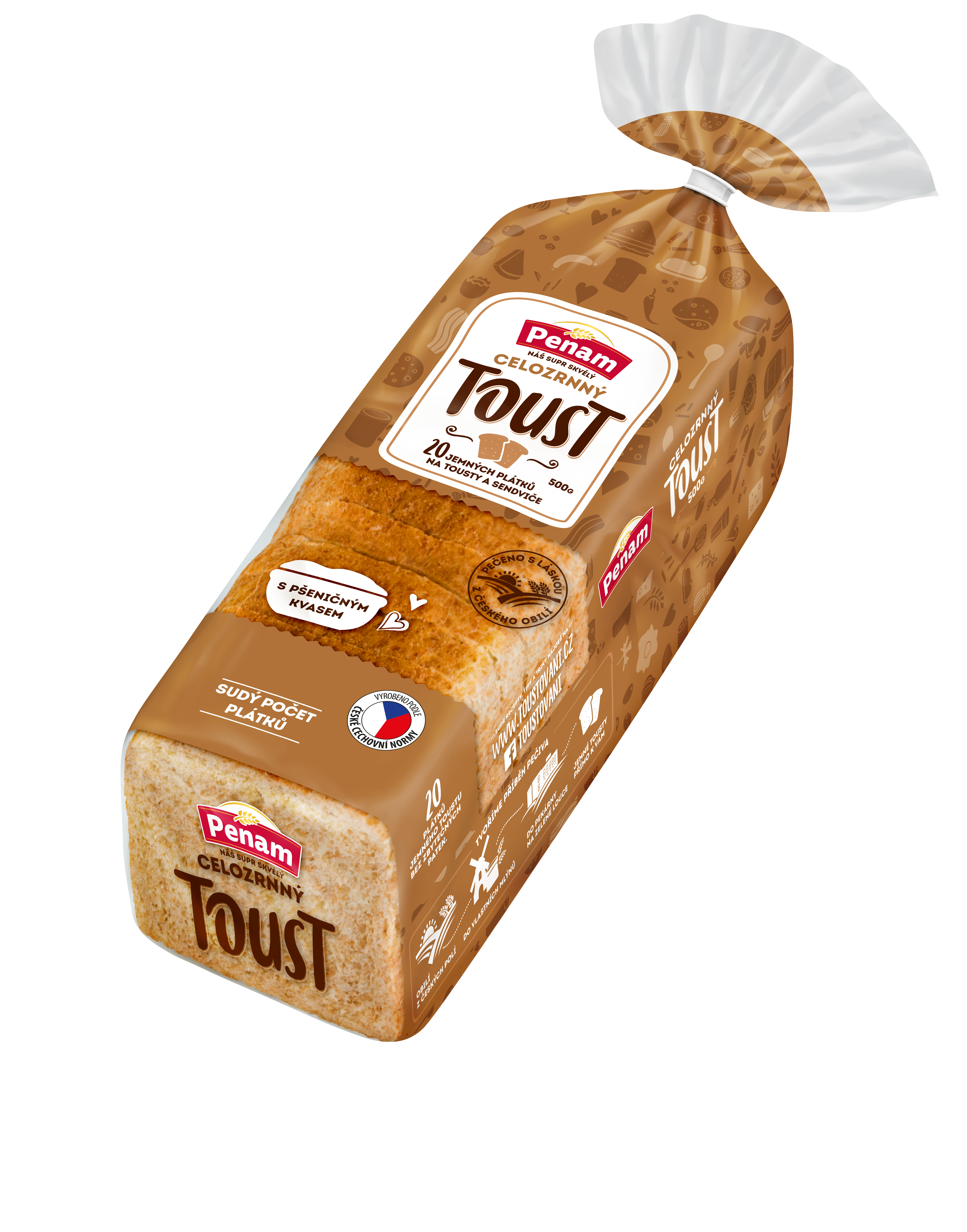 Někdy stačí maličkost, aby byl den o něco lepší. Třeba poctivý toust s 60 % celozrnné mouky, krásně nadýchaný, s příjemnou vůní kvasu a upečený s péčí našich šikovných pekařů. 20 plátků, žádné patky – prostě ideální start. Začněte den tím správným toustem. Toust celozrnný si prostě zamilujete.