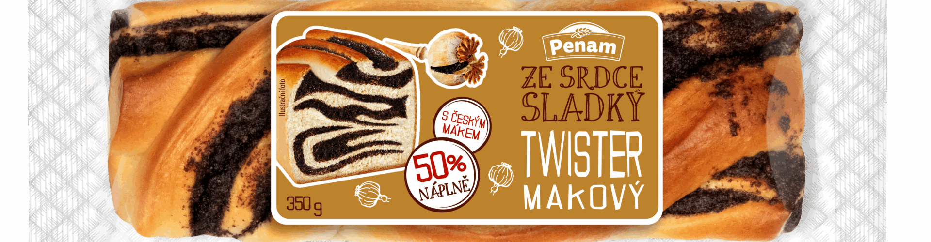 Poznejte inovativní tvar pečiva z prémiové řady Ze srdce sladké od Penamu. Twister makový vyniká netradiční spirálovou formou a výraznou 50 % makovou náplní, která zaručuje skutečně bohatou chuť a poctivou dávkou máku v každém kuse.